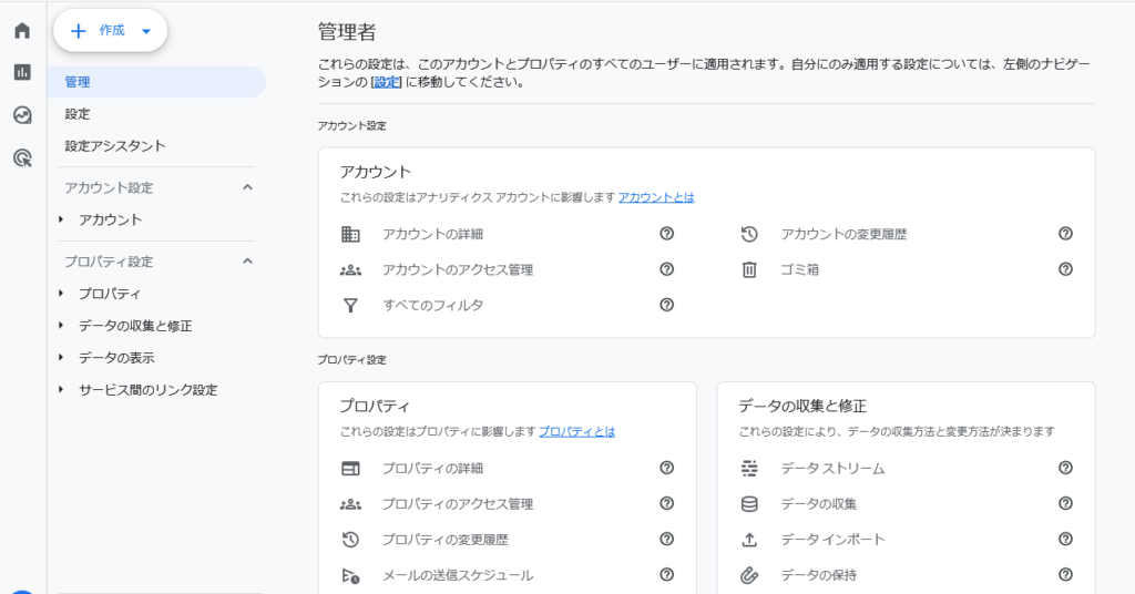 画面左上の『作成』より『プロパティ』をクリックして、アナリティクスへサイトやブログの設定準備を進めます。