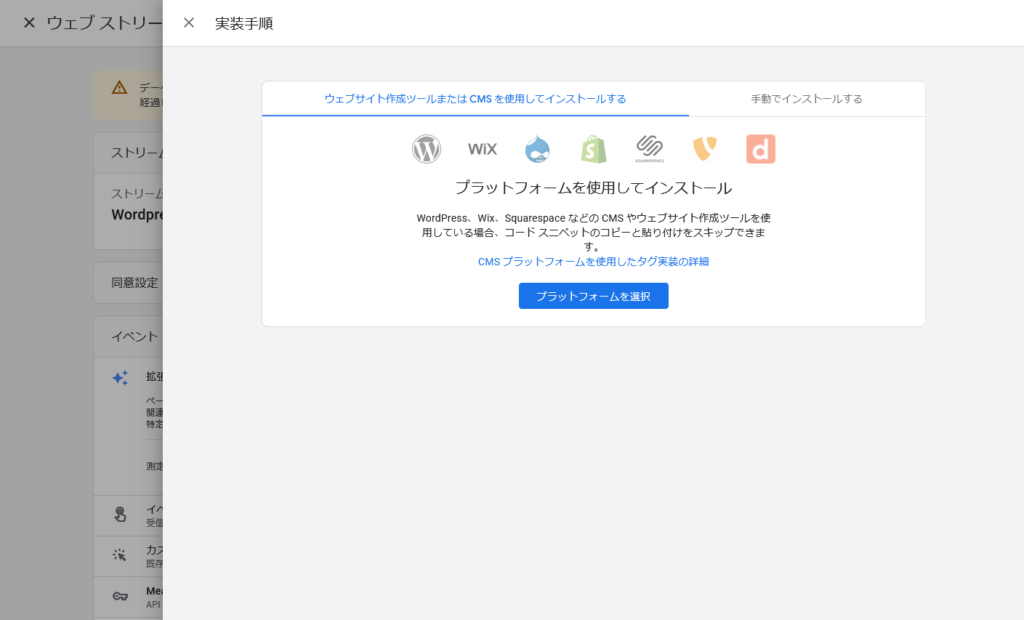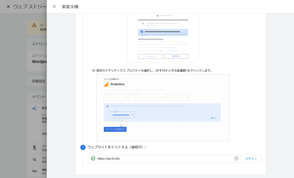 >アナリティクスの画面でプロパティの実装手順を開く