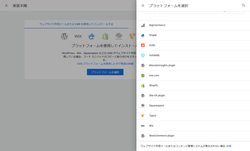 プラットフォーム選択で、Site Kit Pluginを選択すると、設置方法の説明画面が表示されますので、