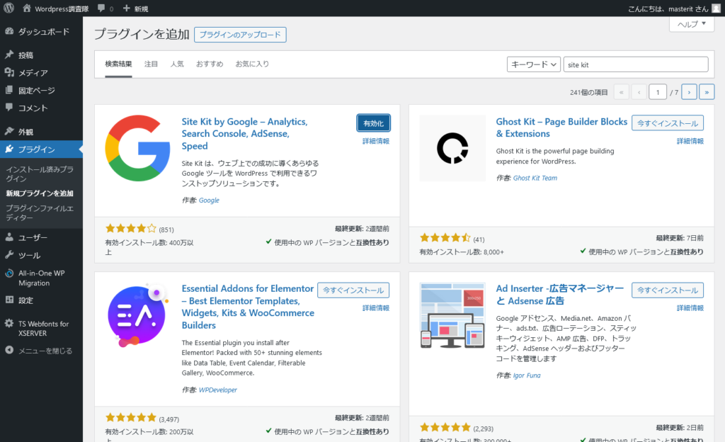 ダッシュボードで『Site Kit プラグイン』をインストール